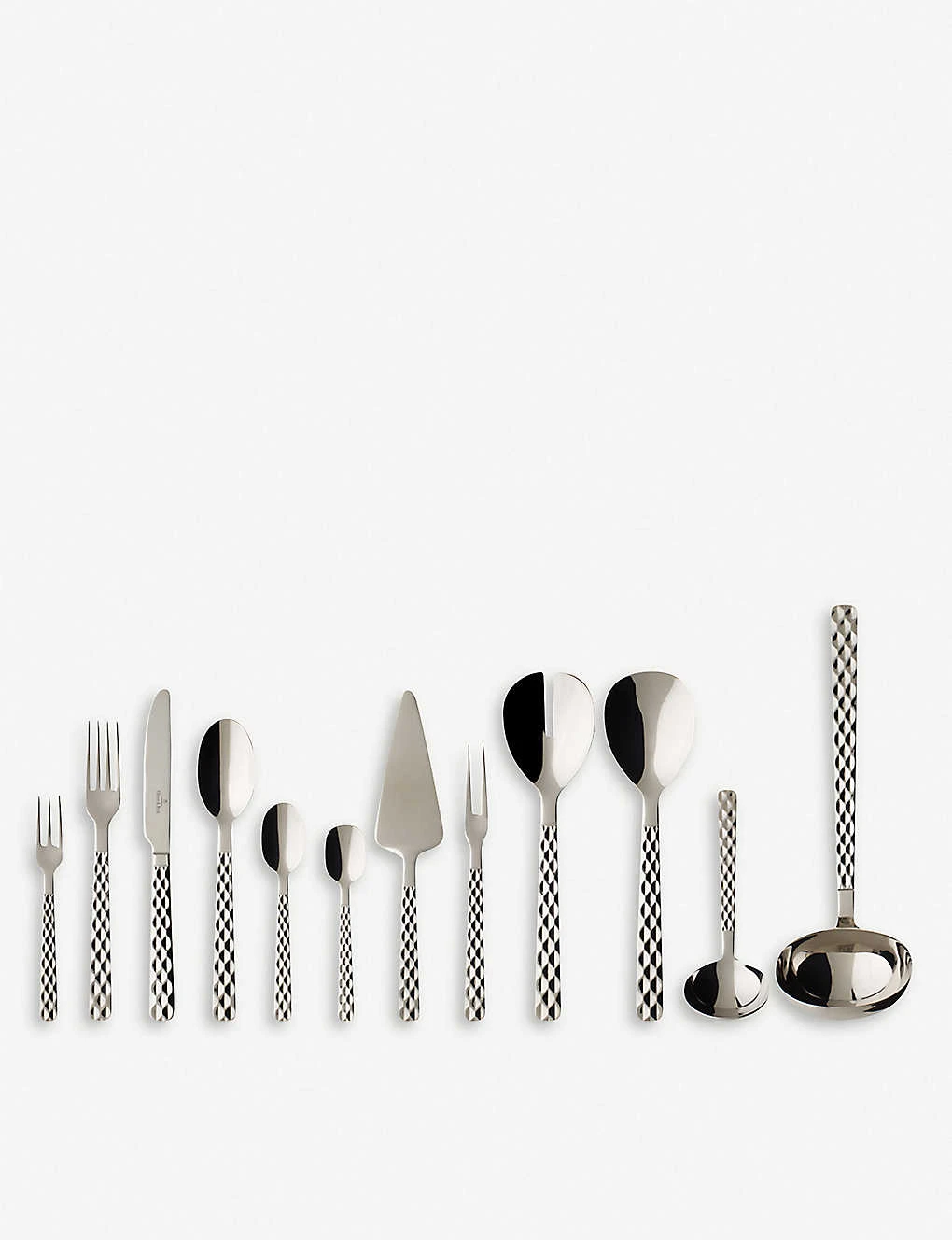 Set contains: 12 dinner spoons, 12 dinner forks, 12 dinner knives, 12 coffee spoons, 12 pastry forks, 3 serving spoons, 2 serving forks, 1 large cold meat fork, 1 gravy ladle, 1 soup ladle, 1 pie server, 1 ice cream spoon, 1 cutlery tray box
